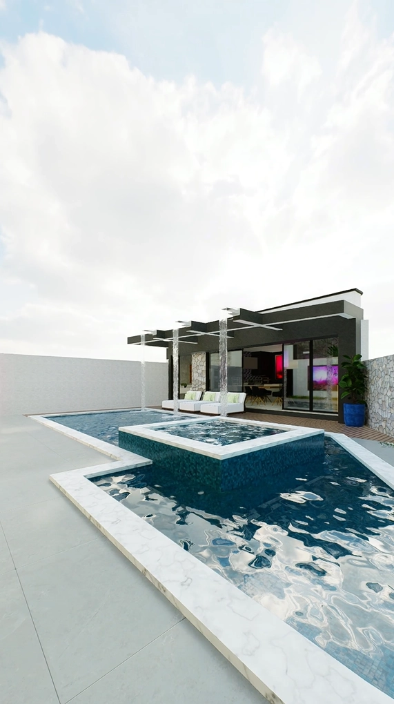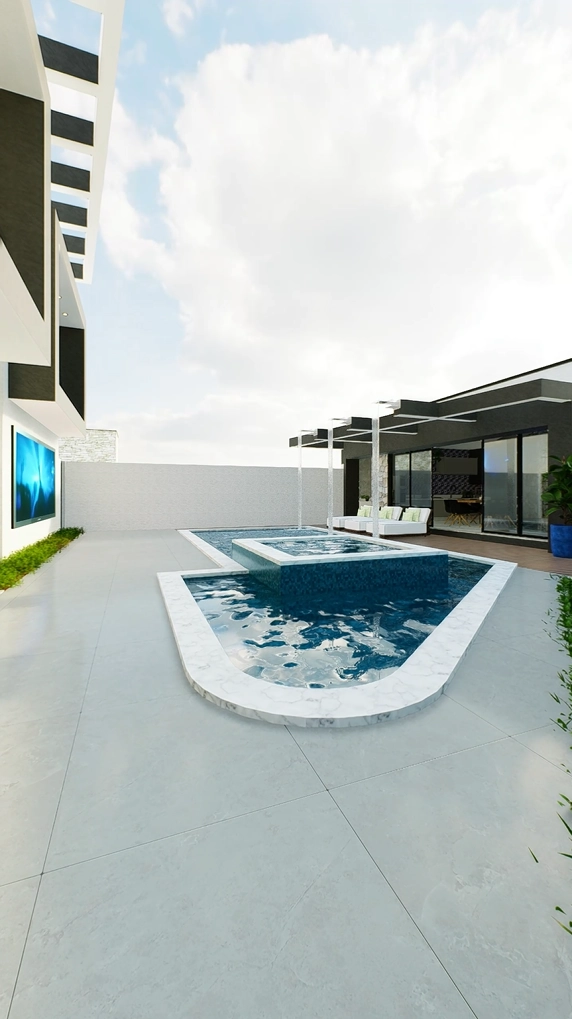 • Piscina com borda molhada e área com jardim